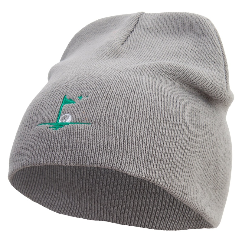 Product, Golf Sport Flag Embroidered 8 inch Acrylic Short BeanieMaterial Composition, Made of 100% acrylicSize Flexibility, One size fits most, fitting up to XLDimensions, Shell measures 8 inches deep and 7.5 inches wideDesign Details, Two layers, flexible