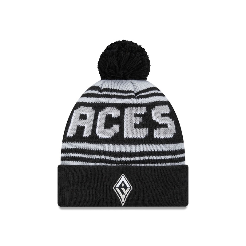 The Las Vegas Aces 2024 Team Pom Knit features a Aces logo at the brim with a team wordmark at the crown and a one-time removable pom.