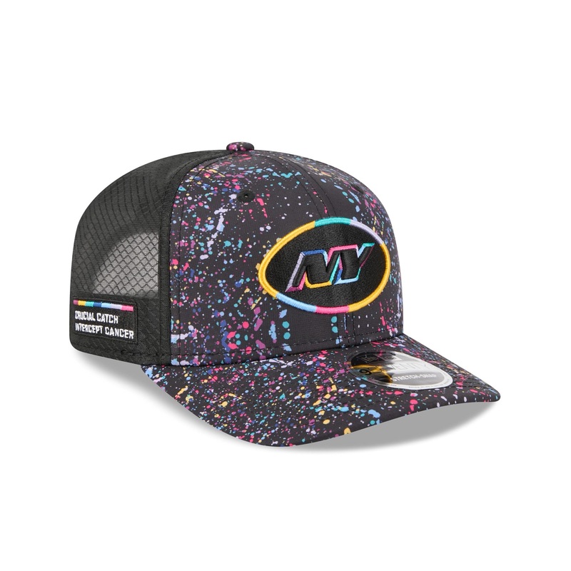 The New York Jets 2025 Crucial Catch 9SEVENTY Trucker features an embroidered Jets logo at the front paint splatter panels with a woven NFL Shield tag above a snapback closure at the rear. Additional details include a Crucial Catch Intercept Cancer patch at the right-wear side with performance mesh rear panels and a black undervisor.
