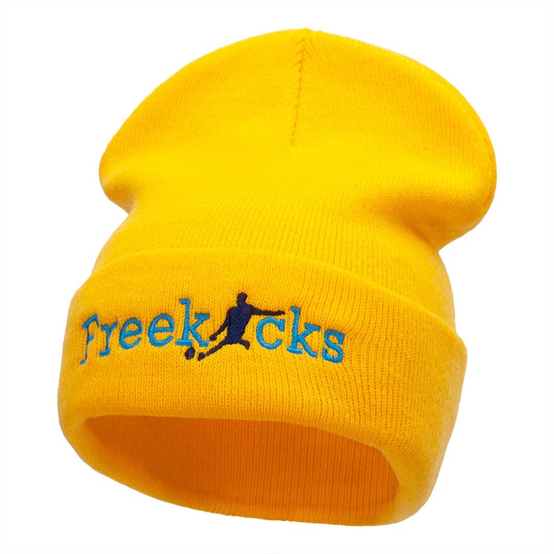 Product Type, Soccer Free Kicks Embroidered 12 Inch Long Knitted BeanieMaterial Composition, Made of 100% AcrylicSize Flexibility, One Size Fits Most, Stretchable up to XLProduct Dimensions, 12 Inches Deep, 8 Inches Wide, Cuff Measures 3 Inches LongSuitabl